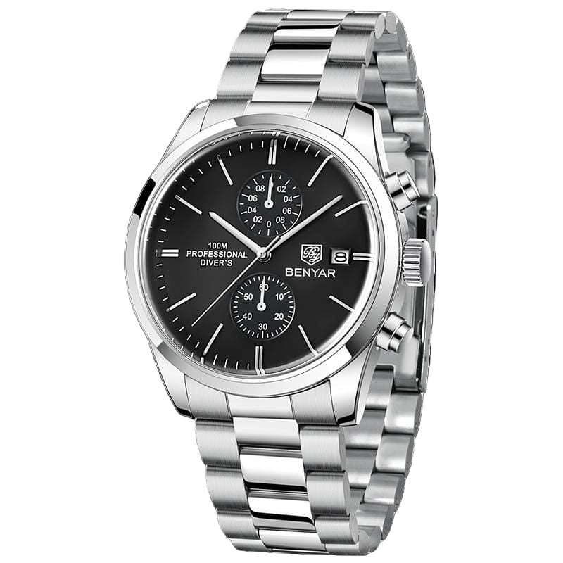 -Cadran noir élégant avec sous-compteurs chronographes.